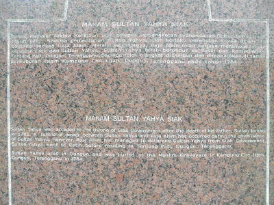 Ia adalah milik Sultan Yahya yang pernah memerintah kerajaan Siak di Sumatera lebih 200 tahun lalu. Tetapi atas sebab tertentu baginda membawa diri ke sini.
